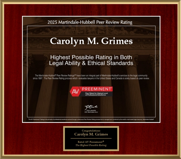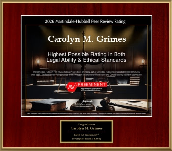 Consistently named a ‘Best Lawyer’ (from 2014-2023), Ms. Grimes has also been honored as an AV Preeminent (2001-2022) and Gold Client Champion (2019-2021) by Martindale-Hubbell. In addition, she’s been named a Top Lawyer by Northern Virginia Magazine Magazine (2011, 2015, 2017, 2019, 2020, 2021), a Top Attorney by Arlington Magazine (2019-2021), and a Top Attorney by Washingtonian Magazine (2015) as well as many other top attorney designations— see full list below. Ms. Grimes actively serves the community as well. She was the 2009 and 2006 President of the Board of Directors for Legal Services of Northern Virginia (LSNV), has served on its Board for many years and has performed many hours of pro bono work for the organization. She is a Past President of the Alexandria Bar Association, for which she has co-chaired the Pro Bono and Community Service Committee and chaired the “Beat the Odds” Program, a scholarship program for youths who have overcome adversity. She also participated in the American Bar Association program offering legal assistance to victims of the September 11, 2001, attacks.